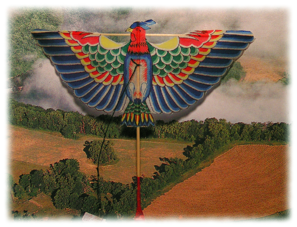 This kite is a much smaller, much simpler version of a Chinese Pheasant kite that's been around forever. This one has a sail dimension of about 3"W x 1½"H. I print these on Japanese tissue with a color laser printer so the ink doesn't fade or smudge, then cut them out by hand. The spars are hand split bamboo, with a curve steamed into the horizontal spar. The tails on this are about 18" long, but the kite pulls them very easily. |