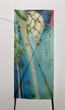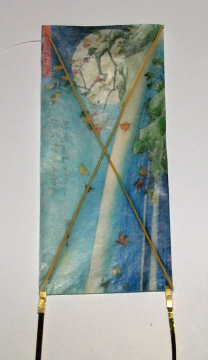 I have a friend in Florida that I've never actually met. Gary Resnick makes and flies all sorts of stuff. During the last few years, he's sent me a prototype line dropper thing that might wind up here on another page, if I ever get around to it, and traded me a Japanese Koinobori for a small train of my diamond kites. Recently, he sent me this beautiful miniature he made, and I want to share it with you. It has a delicate tissue sail, and finely split bamboo spars. Some of the work on this is far beyond my skills, and reminds me of the Charlie Sotich kites I have, and have seen. Again, I wanted to share it with you. |